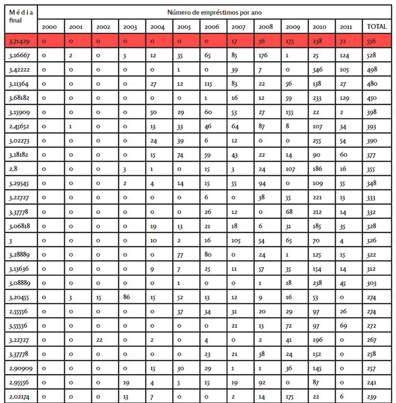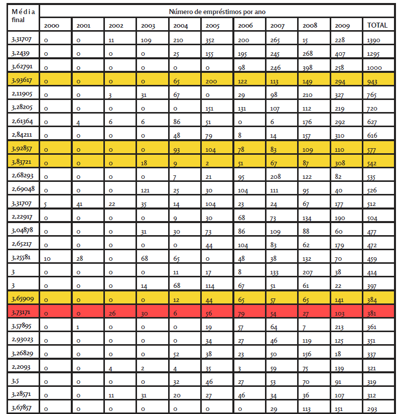 Nas tabelas, optou-se por realçar os alunos laureados. Foi preciso, porém, criar uma segunda distinção para os laureados, pois algumas turmas possuíam mais de um aluno laureado. Sendo assim, os alunos laureados que foram entrevistados estarão realçados na cor vermelha e os alunos que foram laureados, porém não foram entrevistados, estarão realçados na cor amarela. A ordenação das tabelas é feita pelo número de operações de empréstimo.