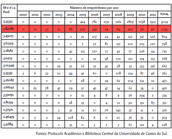 Ao comparar os dados dos empréstimos de livros das turmas pesquisadas com as médias finais, evidenciou-se que aqueles alunos que menos utilizaram os serviços de empréstimos são os que apresentaram os desempenhos mais baixos. Além disso, constatou-se uma tendência de que os alunos com as melhores médias são os que mais usufruíram dos serviços de empréstimo da Biblioteca Central da Universidade de Caxias do Sul. Sobre isso convém recordar que, no período pesquisado, o empréstimo de livros era o principal serviço da biblioteca, a qual não disponibilizava o uso de livros digitais.