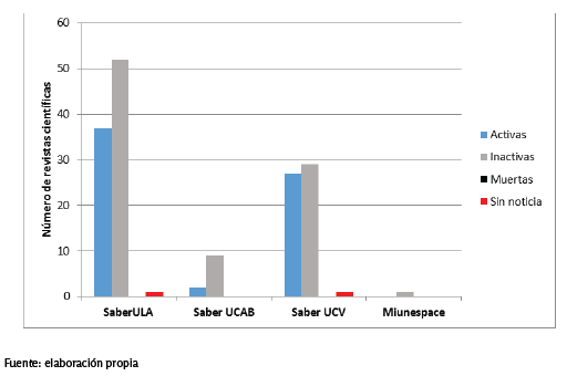 Bajo tales condiciones descritas, se encontraron 159 medios especializados en los cuatro dispositivos electrónicos: 90 de SaberULA, 11 de Saber UCAB, 57 de Saber UCV y uno de Miunespace. En el primero de ellos hay 37 activas, 52 inactivas y una sin noticia; en la otra universidad pública, 27, 29 y una, respectivamente. En la UCAB, dos activas y nueve inactivas; y en la UNE, una sola, inactiva (Figura 4).