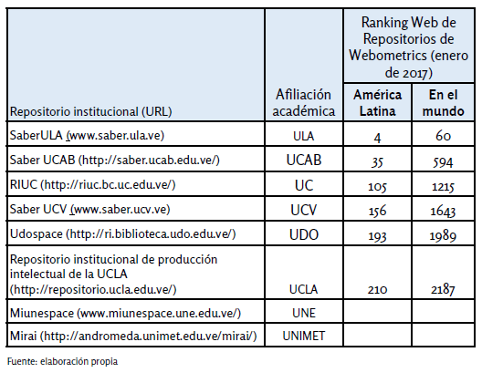 Ahora bien, en acuerdo con la última medición de este reporte (enero de 2017) están posicionados en todo el planeta 2284 RI. El 75 % de los ocho correspondientes a la muestra se encuentran allí, pero apenas dos de ellos se ubican en el top 100 de América Latina: SaberULA en el cuarto lugar −solo por detrás de tres pares universitarios brasileros− y Saber UCAB en el renglón número 35.