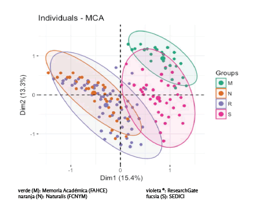 La dimensión 1 (eje horizontal) discrimina principalmente a los docentes-investigadores por la institución de pertenencia y por su mayor o menor presencia en las plataformas. Así, la FAHCE se asocia principalmente a su repositorio Memoria Académica (M) como también al repositorio central SEDICI (S), ubicándose ambos en el extremo derecho del eje horizontal. Por otro lado, la FCNyM se ubica a la mitad izquierda de dicho eje, asociada a su repositorio Naturalis (N) y a RG (R). La FCE aparece también en este sector, aunque más hacia el centro del eje y más asociada a RG (R). La dimensión 2 (eje vertical), discrimina por grupo etario, categoría de investigador y cantidad de documentos. Aquí puede verse que los más jóvenes, con categorías inferiores y con menos cantidad de documentos se ubican en la parte inferior del eje, mientras que los docentes-investigadores de mayor edad, categorías más altas y mayor cantidad de trabajos depositados se posicionan en la parte superior del mismo.
