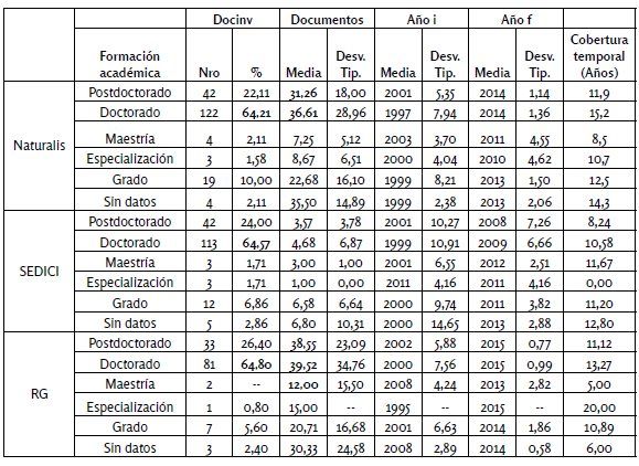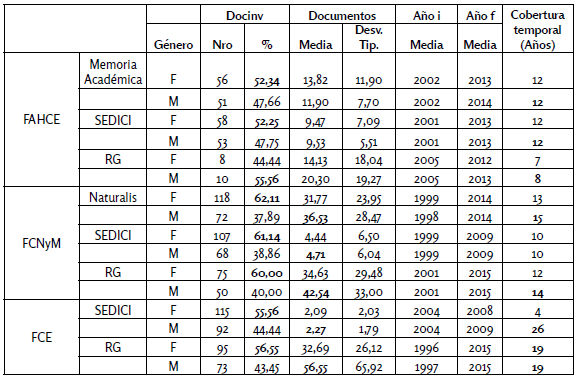 En términos de la cobertura temporal de los documentos se observa una mayor amplitud en RG para el caso de la FCE, cuyos valores medios de primer y último año de los documentos son 1996 y 2015, respectivamente; mientras que su cobertura en el repositorio central de la universidad abarca un período más acotado, con una amplitud de 5 años (2004-2009). La FCNyM presenta una mayor cobertura en años en el repositorio propio (1998-2014) y luego en la red social (1999-2015), y notablemente menor en el repositorio central (1999-2009). En ambos casos, el repositorio central registra una menor actualidad de los documentos. La FAHCE, en cambio, presenta una cobertura similar en los repositorios (2002-2014 en Memoria Académica y 2001-2013 en SEDICI), y más acotado en la red social (2005-2012).Debe tenerse en cuenta, que aunque la edad como la trayectoria del docente investigador puedan tener influencia sobre esta variable, lo que resalta son las diferencias entre plataformas para la misma población.