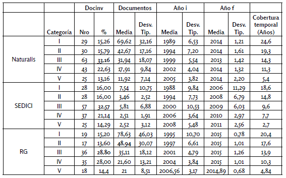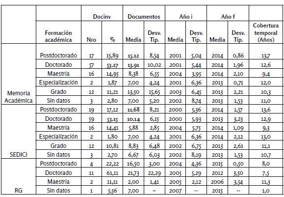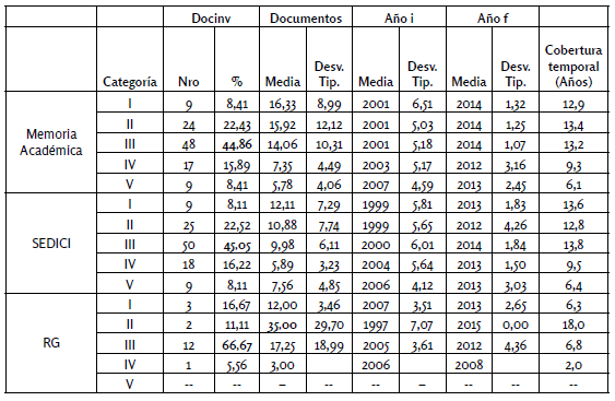 El hecho de que a mayor edad y categoría de los docentes-investigadores, mayor es el número medio de documentos visibles en los RIS y en RG, a la vez que es más amplia la cobertura temporal de los documentos respecto de la producción de los grupos más jóvenes y con categorías inferiores, no parece más que obedecer a la lógica de a mayor edad/mayor vida académica.