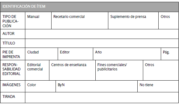 Para la recolección de datos se diseñó un formulario que se estructura en dos partes. Una primera parte donde se registran los datos de identificación del ítem (autor, título, ciudad, editorial, año, tirada, entre otros) y una segunda parte donde se registra información tanto cualitativa como cuantitativa sobre el contenido de la obra (imágenes, menciones a aspectos relacionados la higiene, información nutricional, cocina regional, clasificaciones por tipo de alimentos y sus diversos usos, consejos sobre economía doméstica, representaciones sociales, uso de la tecnología, entre otros).