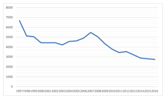 En la figura 2 se ofrece la evolución anual de la tirada media de ejemplares por título publicados en España de 1997 a 2016 (en miles de ejemplares) que, como se puede observar, ha ido disminuyendo progresivamente: en 2016 la tirada media ha sido de 2.740 ejemplares, mientras que, en 1997, la tirada media se situaba en los 6.670 ejemplares, lo que ha supuesto una reducción de la tirada media en un 59% para el período considerado. Sin embargo, se da la circunstancia de que, en el mercado editorial español, coexisten obras con fuertes tiradas y libros que no alcanzan los 1.000 ejemplares.