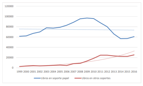 No será hasta el 2008 cuando la producción en libro en papel comience a caer mientras que, al tiempo, la producción de libros en otros soportes, como el libro electrónico, aumente.