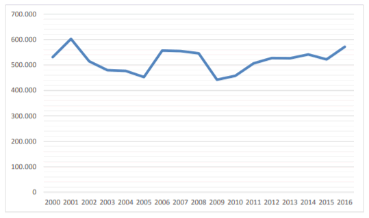 La figura 4 presenta la evolución anual del valor total de las exportaciones de la industria del libro de España entre 2000 y 2016, incluyendo tanto las exportaciones del sector editorial como las del sector gráfico.