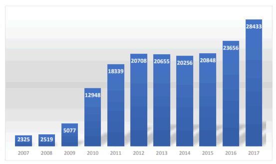 El nivel de desarrollo del mercado del libro digital en España sigue una línea similar a la de otros muchos países de nuestro entorno, con la excepción de —en el ámbito europeo— Reino Unido, país que se sitúa a la cabeza por detrás de Estados Unidos. En el caso de España, la edición electrónica experimentó en los últimos años un aumento significativo. En la Figura 5 se muestra la evolución anual del número de libros electrónicos publicados en España entre 2007 y 2017. En el año 2017 se registraron en España 28.433 libros digitales, que representa casi el 30% de producción editorial, mientras que el 2008, por ejemplo, solo suponía el 2,4%. En 2016, se editaron 23.653 libros digitales, lo que supuso un incremento de alrededor de 2.800 ejemplares con respecto a la cifra registrada el año anterior.