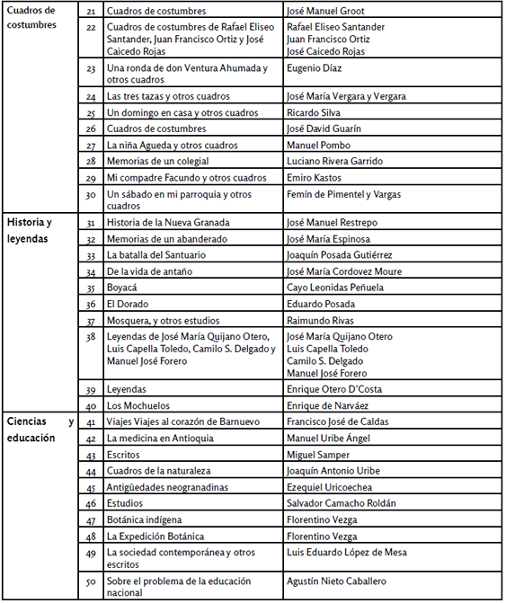 Secciones literarias, títulos y autores de la Selección Samper Ortega de Literatura Colombiana
