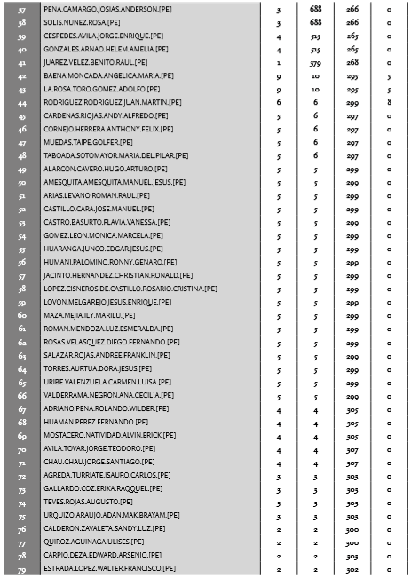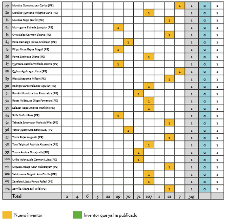 Respecto al ranking de inventores por publicación de patente, el inventor Walter Héctor Gonzáles Arnao es quien presenta más recurrencia de participación, quien ha publicado 90 patentes (26% del total), siendo también quien más participación ha tenido en los grupos de invención. Finalmente, se observa que la mayor participación de inventores se ha dado en el periodo 2014–2016, con 248 participaciones) (Tabla 7 en Anexo)
