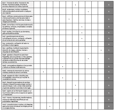 Según el Gráfico 1, 43% de las invenciones aplican a necesidades humanas (Sección A) y 15% a técnicas industriales diversas (Sección B). En el primer caso, la mayor cantidad corresponde a sillas, sofás y camas (A47C), tiovivos; columpios; caballos basculantes; toboganes; montaña rusa; seguida de distracciones publicas análogas (A63G) y mesas; escritorios; mobiliario de oficina; muebles con cajones; cajones; partes constitutivas generales de los muebles (A47B). (Tabla 8 en Anexo)