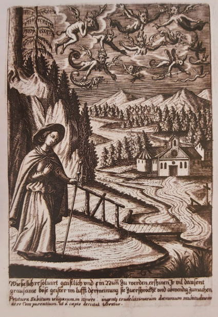 Un recurso argumental de la Autobiografía, relacionado con la asimilación de modelos icónicos, es la intervención divina (o diabólica) que justifica cambios en el desarrollo de la historia y evoluciones del personaje, como en las vidas de héroes y santos. Ana decía que las visiones le habían empujado a defender la idea de profesar en San José de Ávila –convento que acababa de fundar Teresa siendo ya un icono en ambientes devotos– y que, como Teresa misma, “deseava padeçer travajos, desonras, y ser tenida por loca” (Autobiografía A, p. 286); así solicitó a las autoridades el ingreso en el descalzo y, ante la prohibición, veía monstruos y sombras divinas. En la Escena 6 del ciclo de estampas que se editaron en Alemania tras la muerte de Ana en Flandes, aparece la “multitud de demonios crueles -dice la inscripción- queriendo asustarla y hacerla volver atrás” (fig. 1) y, en la Escena 7, la Trinidad, en figura de tres jóvenes, los espanta (Ruiz y Urkiza, 2016, p. 57).6 Se dice que el cura del Almendral, llegado de Ávila, interpretó esas visiones y la dirigió al Carmelo, donde ingresa en 1570. Cuando la invistieron novicia, escogió su apellido de San Bartolomé en honor a otro milagro: la curación de aquellas aflicciones en una ermita. Por entonces Teresa estaba fundando el convento salmantino; volvió a San José en 1577; al llegar, llamó a Ana a su celda y desde entonces fueron inseparables (Autobiografía A, p. 287; Yuste y Rivas-Caballero, 2004, p. 311).