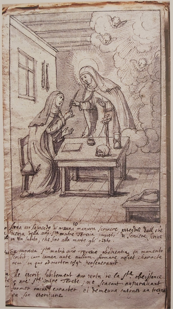 La Escena 10 de las estampas alemanas la representan como copista y secretaria de Teresa en el momento en que esta le cede la pluma en el convento de Salamanca, como Ana cuenta en la Autobiografía.12 El grabado omite algunos detalles respecto al dibujo preparatorio (fig. 2), como las armas de mortificación que cuelgan del muro. La representación promociona la historia y legitimidad del Descalzo como auspicio contrarreformista de una santidad capaz de infundir la ciencia, así como un argumento en defensa de las obras de Ana-escritora por milagro, transmisora de la doctrina espiritual y de la norma de comportamiento terrenal de las monjas, frente a sus detractores: sus interpretaciones de las Constituciones teresianas tenían que ser las buenas, si había aprendido a escribir de la voz letra de la madre.13