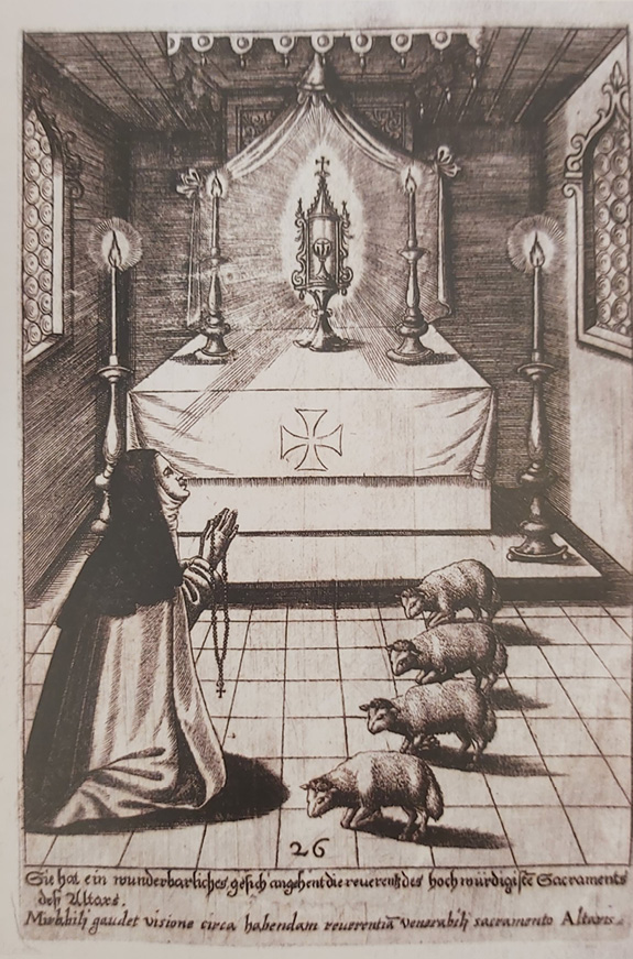 Se supone que la monja no reconoce el símbolo que describe hasta que se le desvela en la locución que acompaña a esta visión; pero al menos ella tenía que haber servido en la liturgia de los conventos donde profesaba y había recibido la catequesis que enseña la relación figural del Cordero y la Eucaristía. La locución explica esa asociación visual de Viejo y Nuevo Testamento, y así fue grabado en la Escena 26 del ciclo de estampas (fig. 4) para publicitar un argumento contrarreformista a favor de sacramentos rechazados por los protestantes (Ruiz y Urkiza, 2016, pp. 94-95) si bien Ana incide en el rrecogimiento y rreverencia que le provoca esta imagen, más que en el razonamiento teológico que infunden las diferençias de figuras bíblicas: