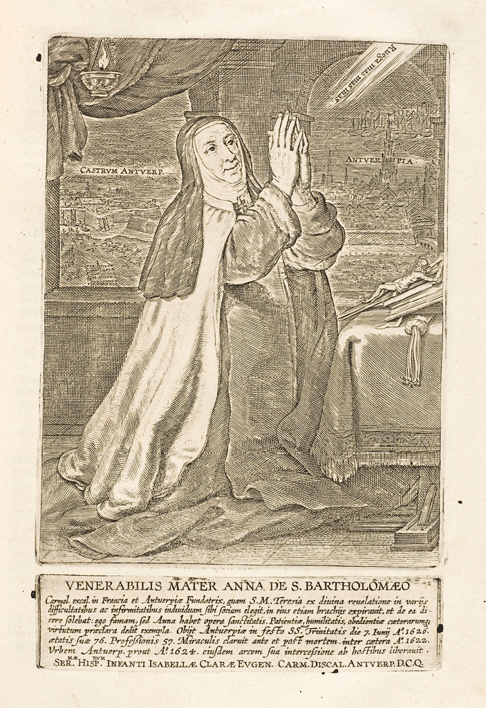 Las inscripciones de uno de los grabados más reproducidos y versionados identifican a Ana van den S. Bartholomeus arrodillada ante el crucificado de bulto que reposa sobre un libro elocuentemente cerrado en un interior conventual austero, abierto al puerto y la ciudad cercada de Antwerpen. Ana no mira a la escultura sobre el libro sino al haz de rayos que baja del cielo a sus manos orantes y le arenga con una locución en pro de la victoria bélica, política y religiosa: Ora magis magis magis. De esta estampa, impresa hacia 1626, se conocen versiones que traducen al castellano las inscripciones: “La venerable madre Ana de S. Bartolomé. Ruega más más más” (fig. 7). Este Verdadero retrato combativo podía recortarse hasta dejar su medio cuerpo aislado en detrimento de la narración histórica, acaso conocida por otros medios, o recordada por escrito en la estampa, potenciando a cambio los estímulos a la devoción de un busto naturalista enmarcado. La beata, en los óvalos, mira al crucifijo que sigue sobre la mesa, junto o sobre el libro cerrado.43 Las copias del siglo XVIII añaden inscripciones que recuerdan a la heredera de Teresa, beata por sus milagros. Franz de Wilde hacia 1917 viró ligeramente el punto de vista de la composición y destinó la superficie de la mesa a ampliar la inscripción de una historia ya remota.
