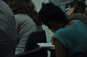 Descripción de imagen: en primer plano, una persona sentada en un pupitre toma nota en un cuaderno.