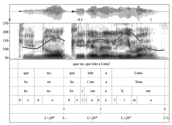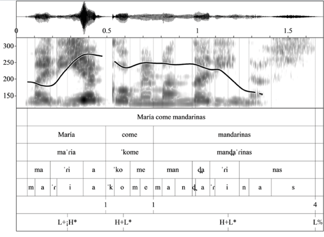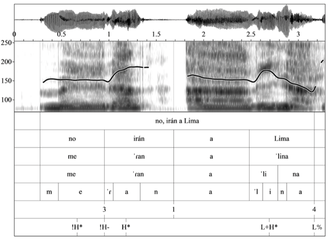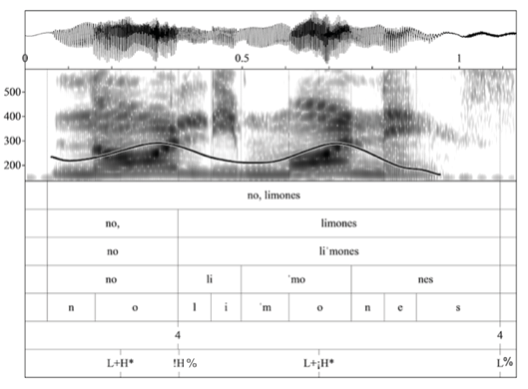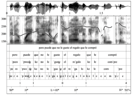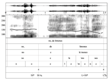 2 La transcripción del tono de frontera M% fue, posteriormente, modificado por !H% (Frota y Prieto 2015). En el presente artículo, la hemos transcrito de acuerdo con su actualización.
