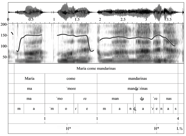 4 La transcripción del tono de frontera bitonal HH% fue, posteriormente, modificado por el tono de frontera monotonal H% (Frota y Prieto 2015). En el presente artículo, la hemos transcrito de acuerdo con su actualización monotonal.