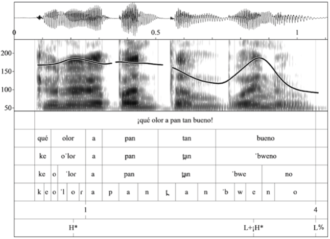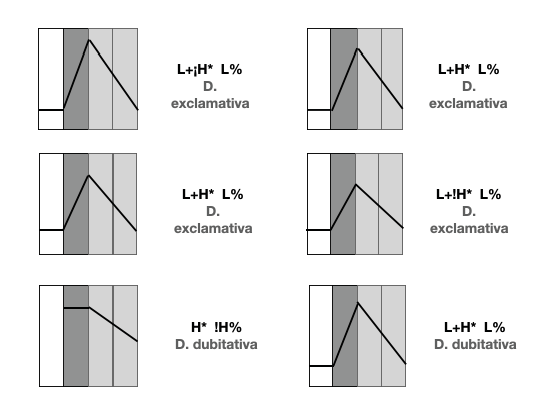 Los acentos nucleares de las declarativas exclamativas fueron L+¡H* y L+H*, coincidiendo, nuevamente, con la variedad del español de Santiago de Chile. De acuerdo a estos patrones, el grado enfático de la exclamación se manifiesta, entonces, mediante el ascenso en la sílaba tónica de su configuración nuclear.