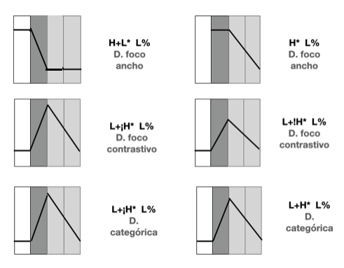 Los acentos nucleares más recurrente de las declarativas categóricas fueron L+¡H* y L+H*, respectivamente. De estos patrones se desprende que el tono extra alto y, en segundo lugar, el tono alto manifiestarían la fuerza ilocutiva del hablante respecto de lo que desea expresarle enfáticamente a su interlocutor. Esta configuración fue encontrada también en la variedad santiaguina.