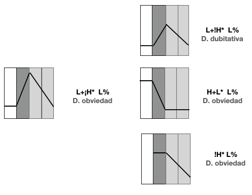 De acuerdo a Ortiz-Lira, Fuentes y Astruc(2010), las declarativas de obviedad manifiestan sorpresa, un tanto irónica, por parte del hablante que responde a una pregunta, cuya respuesta es evidente y ya sabida por todos. Esta intención se expresaría mediante el contorno reportado con upstepped L+¡H* L%, pues este tono extra alto marcaría la fuerza ilocutiva en la respuesta del hablante.