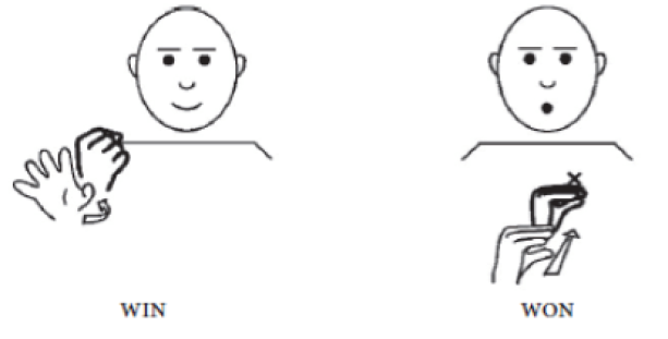 Otro caso reportado de verbos específicos que llevan marcas de tiempo, es el de la Lengua de Señas Británica (BSL), en la que hay dos formas verbales diferentes para el verbo WIN y WON, como se ve en el ejemplo (6) presentado en Pfau (2016a, 207):