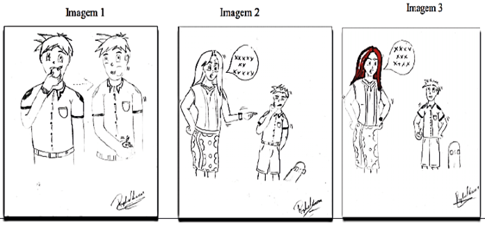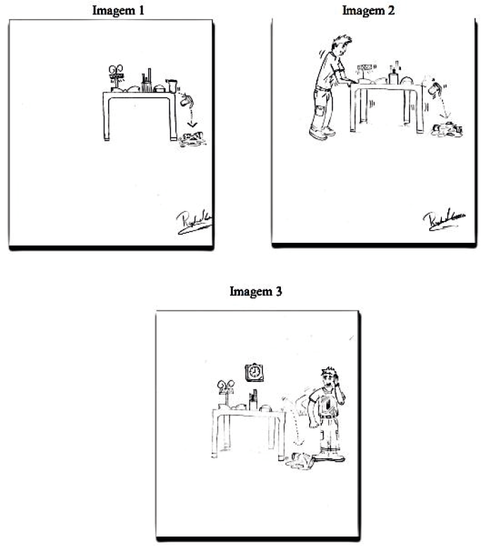 Como informado na seção anterior, a geração de dados se baseou em quatro roteiros. O primeiro roteiro ilustrado6 apresentou uma sequência de três imagens, reproduzidas a seguir: