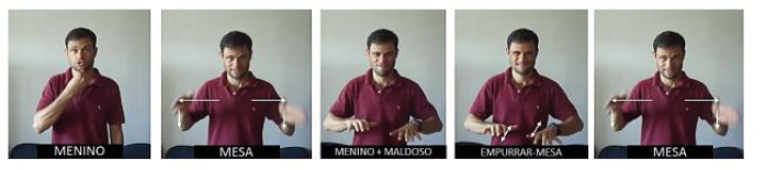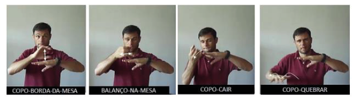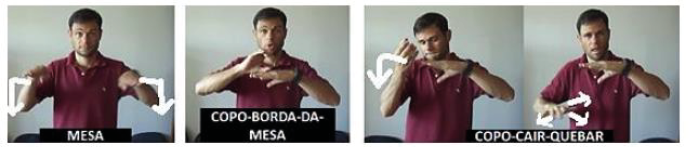 O colaborador construiu a cena, informando primeiramente os referentes por meio do que pode ser, inicialmente, classificado como um tipo de predicação não verbal: “(havia) uma mesa”, “(havia) um copo na borda da mesa”. Só depois produziu, no terceiro quadrante do exemplo 1, o enunciado esperado: o copo caiu. Nesse momento, utilizou-se da expressão não manual (com o movimento da boca) e da mão espalmada para dizer também que o copo quebrou.