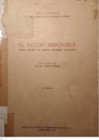 » Jarach, Dino. 1943. El hecho imponible. Teoría general del derecho tributario sustantivo. Con un prefacio del Prof. Dr. Camilo Viterbo. Buenos Aires: Edición de la Revista de Jurisprudencia Argentina, S. A. 184 págs. [En la tapa, bajo el nombre del autor, figura la leyenda: Profesor Contratado en la Universidad de Córdoba].