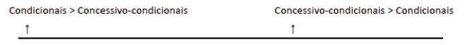 A fim de representar essa constatação, propomos o cline da figura 4 que mostra que aun si condicional e concessivo-condicional convivem, no espanhol, desde o século XIII mas em proporções que se modificam ao longo das sincronias: enquanto no século XIII prevalecem os padrões condicionais sobre os concessivo-condicionais, no século XXI, essa proporção se inverte, com as concessivo-condicionais constituindo o padrão mais sedimentado para as funções de aun si.